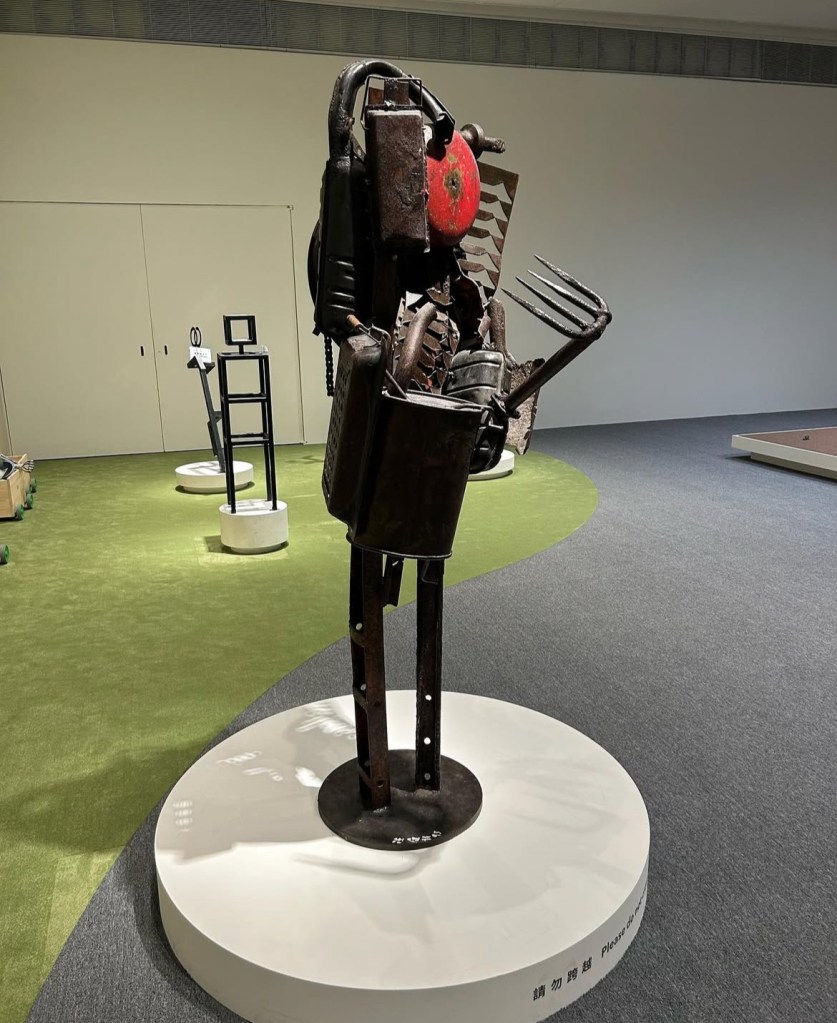 在尚未觀展前,我瀏覽了北美館的網站,最期待的作品便是陳庭詩。過去我對他的認識多停留在版畫創作,例如《日與夜(紅與黑)》(版畫,124x64cm,國立臺灣美術館),卻未親眼見過他的雕塑。《將軍》是一件令人印象深刻的作品,手持武器和盾牌,臉部以鮮紅色警鈴構成,盾牌是烤盤,四齒叉則化作武器,遠遠望去彷彿是一位紅臉軍人緩步而來。雖然缺乏動態感,但色彩配置和諧,廢鐵拼組的細節也展現了創作者的用心。