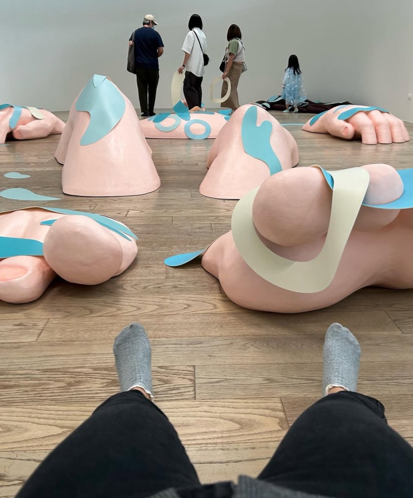 來自法國的藝術家與視覺場景設計師艾蜜莉.法奕夫(Emilie FAÏF),其作品《洗澡》(baignade,2023)以龐大的尺度帶來震撼。觀眾可以將水波紋放在主人翁身上的肚臍、手、膝蓋、鼻孔間或是頭髮上,層層堆疊,宛若在與藝術家展開一場輕鬆而直接的對話。