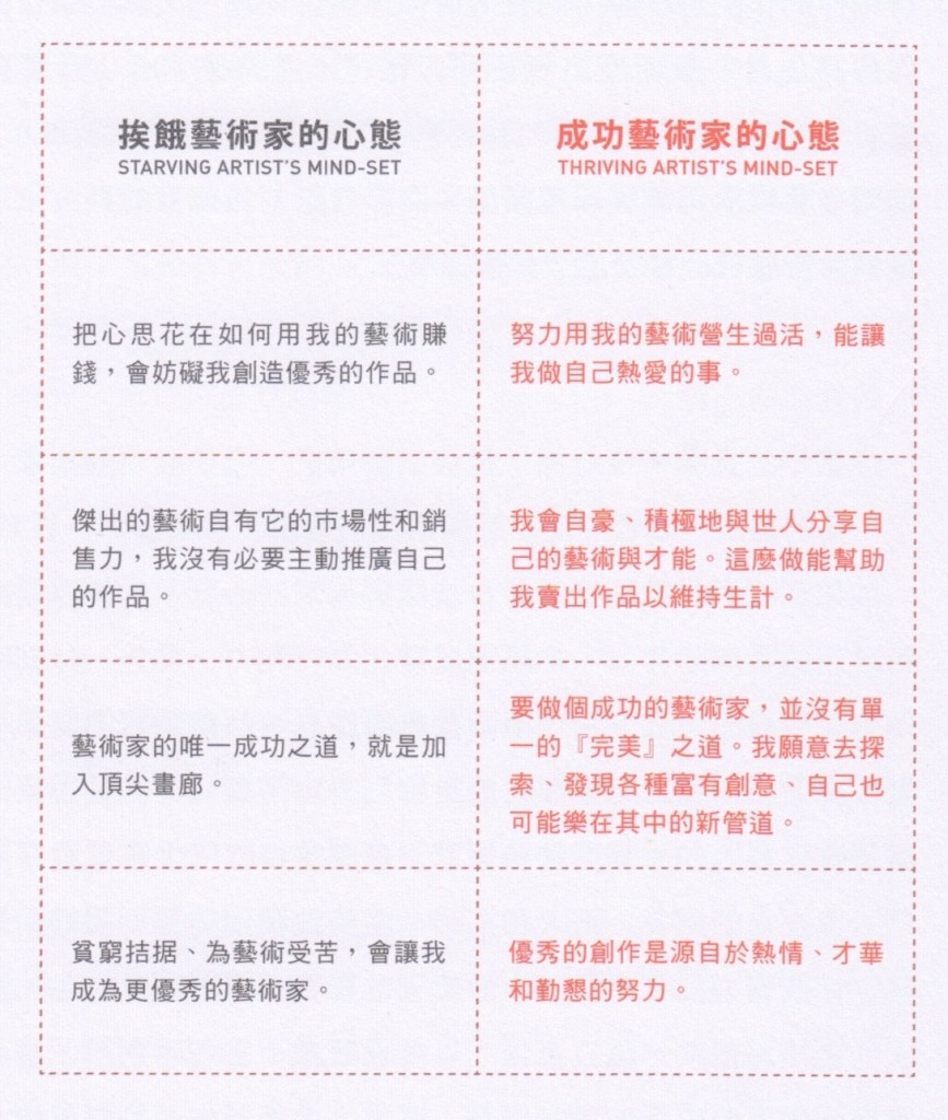 書中最令我印象深刻的,是對「心態」的分類與轉變。作者區分出「挨餓藝術家心態」與「成功藝術家心態」——前者專注於創作、不重視推廣與銷售,而後者則懂得多元收入與積極經營自己。這樣的對照,讓我重新審視自己對藝術工作的看法。