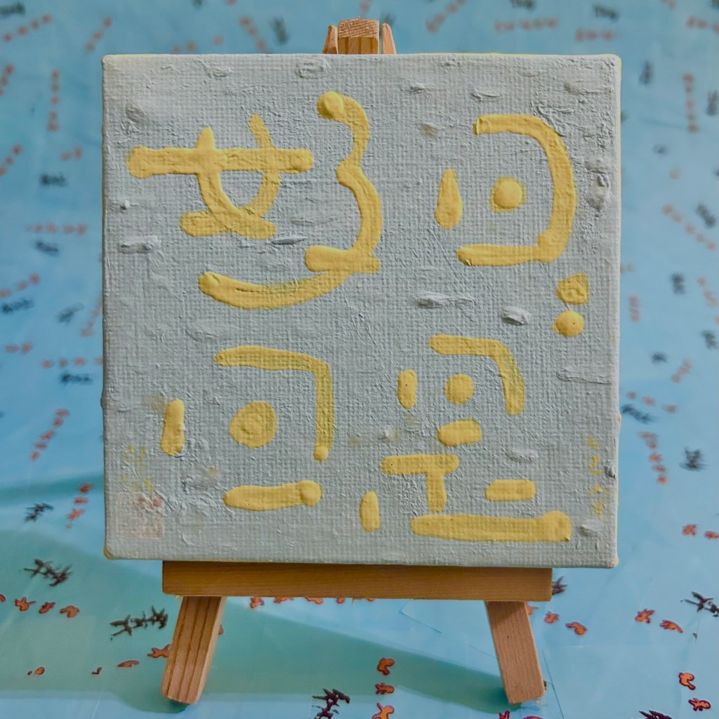 《空語之聲》源自我對網路語言現象的觀察。靈感來自社群平台上充斥的空洞語句——像是「聽君一席話,如聽一席話」這類言之無物卻充滿儀式感的話語。作品以米色壓克力書寫這段語句,左側蓋上「公三小」的印章,作為對主題的諷刺呼應。