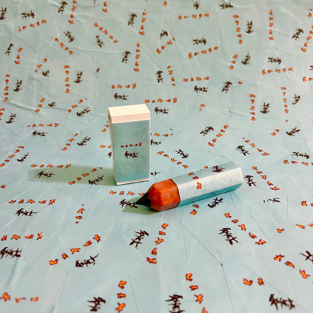 鉛筆與橡皮擦的紙包裝上,印有我個人品牌的標誌,作為自我價值觀的延伸與展現,也象徵這場書寫與抹除的行動,是由我主導、承擔與宣示的。